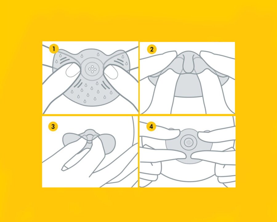 3. Hold the wings of the shield, push the tip of the shield halfway in with your thumbs and guide it over your nipple.