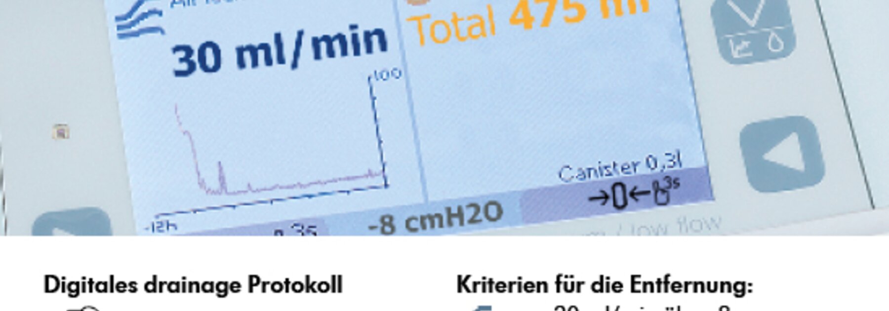 Das Ziel der zweiten Studie bestand darin, mithilfe digitaler Daten des Thopaz+-Systems optimale Kriterien zur Lösung parenchymaler Luftleckagen abzuleiten, mit denen die Dauer der Thoraxdrainage ohne Erhöhung der Komplikationen minimiert werden kann.2 Die Forscher sammelten prospektive Luftstromdaten von 400 Patienten, berechneten den Durchschnitt in 10-Minuten-Intervallen und analysierten Dauer und Wiederauftreten, Häufigkeit und Volumen von Luftleckagen. Mithilfe der Analyse wurden die optimalen Kriterien auf Grundlage der Patientensicherheit (geringe Häufigkeit und Menge wiederkehrender Luftleckagen) und der Effizienz (kürzeste Dauer anfänglicher Luftleckage) ermittelt. Die Autoren kamen zu dem Schluss, dass eine postoperative Luftleckage als behoben gelten kann, wenn die Luftmenge 8 Stunden lang ununterbrochen bei unter 50 ml/Minute bleibt. Die Entfernung des Thoraxdrainageschlauchs bei Erreichen dieses Wertes bei einer Luftleckage wurde im Hinblick auf Sicherheit und Effizienz optimiert.