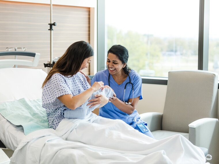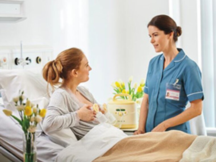 Eine Mutter lässt sich von einer Krankenschwester im Krankenhaus zur Verwendung der Symphony®-Milchpumpe beraten.
