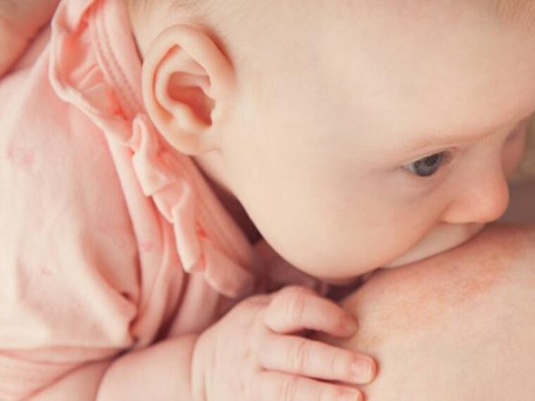 Baby drinking breast milk directly from mother's breast during breastfeeding session
