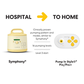 Pump In Style® Pro/Pro+ features our clinically proven pumping pattern, similar to the Symphony® Maintain program. It also has 16 similar pumping levels and two modes (Stimulation and Expression) asSymphony®, providing consistent care. The similarity in technology between Symphony® and Pump In Style® Pro enables a seamless transition from hospital to home without any confusion.