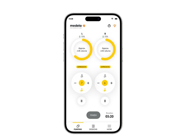 The Medela Family Pump Control app displays information on the active pumping session and saves the session history in the app.