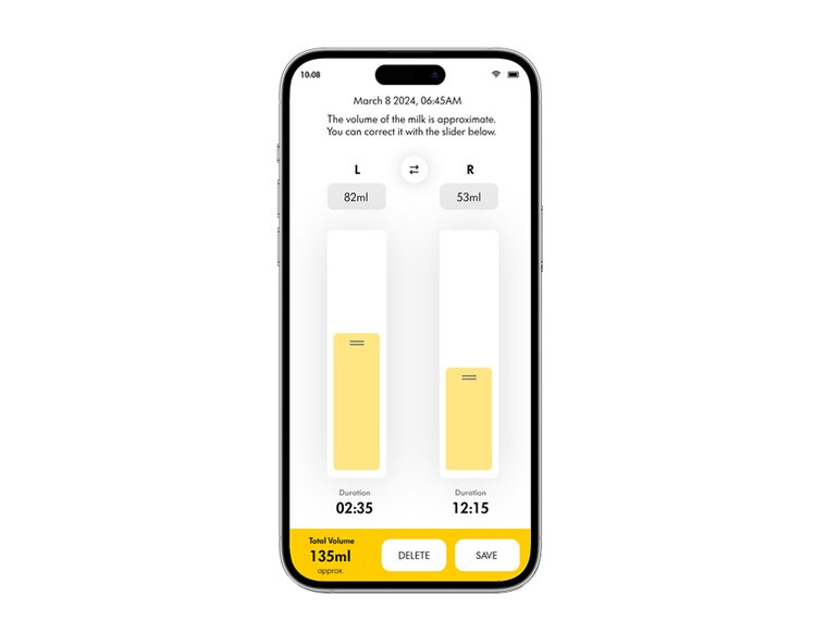 Once milk has been collected into the container, the app will display a screen with detailed information about your pumping session. You have the option to manually adjust the pumped milk volume per side.