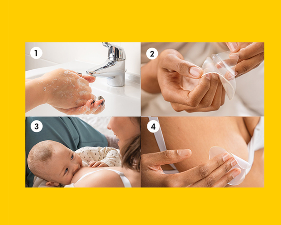 3. Before breastfeeding, remove the pad and put it back on the plastic liner or a clean surface with the gel side facing up. Wash your breast with warm water, pat dry, and start breastfeeding.