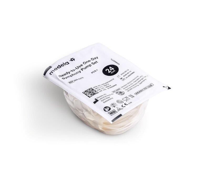 The disposable hospital pump sets for Symphony® are intended to be used by a single user. Depending on local availability, Medela offers Ready-to-Use One-Day pump sets and Sterile Single-Use pump sets in five different breast shield sizes (18 mm - 21 mm - 24 mm - 27 mm - 30 mm). Pumping with the right breast shield size is essential to optimise milk flow. Use Medela's breast shield sizing guide to determine the optimal size.