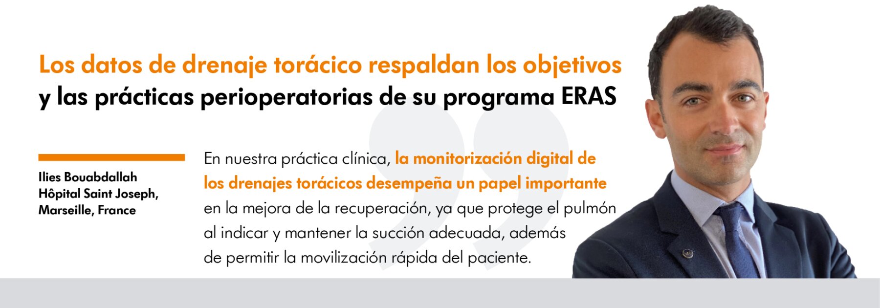Para el posoperatorio, entre las medidas que recomendó el Dr. Bouabdallah se encontraban proteger los pulmones en proceso de curación mediante la monitorización digital del flujo de aire y la presión pleural, aprovechando la naturaleza móvil de los sistemas de drenaje digital para facilitar la movilidad temprana de los pacientes, la fisioterapia, la rehabilitación y el regreso a la actividad diaria antes del alta. Por último, analizó la iniciativa de su institución de utilizar un programa de seguimiento digital basado en una aplicación para facilitar la monitorización y continuar con la participación del paciente después del alta temprana.