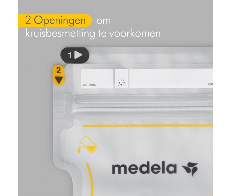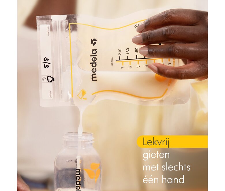 Easy Pour-moedermelkbewaarzakjes zijn recyclebare wegwerpzakjes die gebruikt kunnen worden om je vers afgekolfde moedermelk in de koelkast of vriezer te bewaren. Easy Pour-moedermelkbewaarzakjes hebben twee openingen. Opening 1 voor het ingieten en opening 2 voor het met één hand uitgieten van de moedermelk. Dankzij een betere zuurstofbarrière beschermen ze moedermelk 10x beter dan de vorige zakjes van Medela . Ze hebben een inhoud van 210 ml, een dubbele ritssluiting voor extra bescherming tegen lekken, ze zijn plat in te vriezen en ontdooien snel, en kunnen rechtop staan voor gemakkelijk vullen en hanteren. Ze zijn voorzien van een nauwkeurige schaalverdeling en een schrijfgedeelte om de hoeveelheid en de datum te noteren. Je kunt de maan of de zon op het zakje markeren om aan te geven op welk tijdstip van de dag de melk is gekolfd.