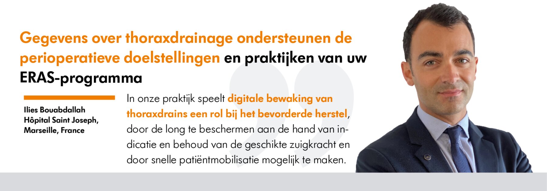 De postoperatieve maatregelen aanbevolen door Dr. Bouabdallah zijn onder andere bescherming van de genezende longen door de luchtstroom en druk op het borstvlies digitaal te bewaken en het benutten van de mobiele aard van digitale drainagesystemen om vroege mobiliteit van de patiënt, fysiotherapie, rehabilitatie en terugkeer naar dagelijkse activiteiten voor het ontslag mogelijk te maken. Ten slotte besprak hij het initiatief van zijn instelling om een op een app gebaseerd digitaal opvolgingsprogramma te gebruiken, om bewaking en betrokkenheid bij de patiënt na een vroegtijdig ontslag te vergemakkelijken.